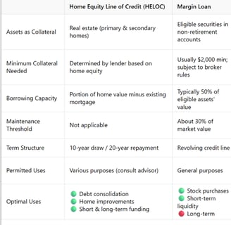Borrowing against your assets can be a strategic way to access liquidity without disrupting your investment portfolio. Here are three primary methods to leverage your assets: Home Equity Lines of Credit (HELOCs), Margin Loans, and Securities-Based Lines of Credit (SBLOCs). Here's an overview of each option: