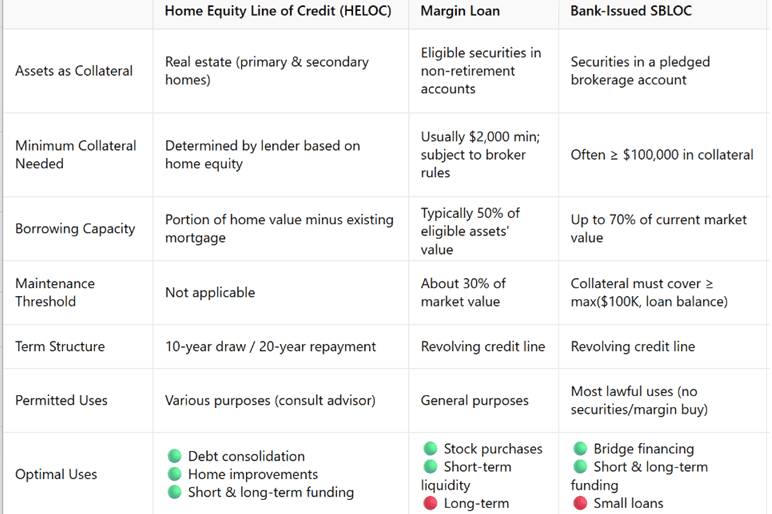 Each borrowing option has its own advantages and risks. HELOCs are suitable for homeowners seeking flexible funding for various needs. Margin loans can be beneficial for investors looking to leverage their portfolios for additional investments. SBLOCs offer a way to access liquidity without selling investments, preserving your long-term financial strategies.